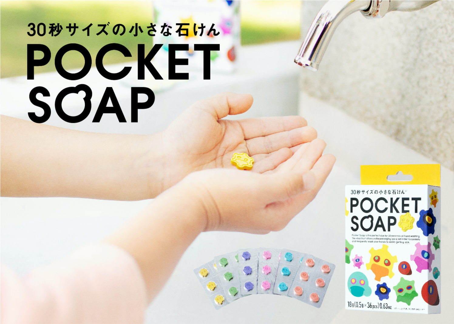 「POCKET SOAP」は、手洗いの推奨秒数である30秒程度で消えるようになっています。このウイルスを可視化した石けんを使い切ると、実際のウイルスもなくなる感覚を体験できる石けんになっており、子どもたちが楽しみながら手洗いをすることができます。