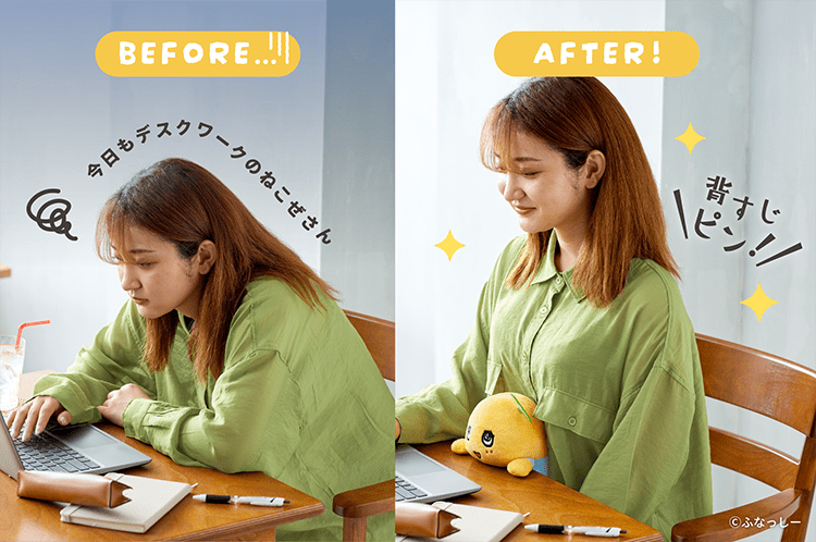 「ふんばるず」を落とさないよう、机とおなかの間にしっかり挟み込むため、自然と背筋が伸び、良い姿勢に。ついつい“猫背”になってしまうあなたも、シャキッとした背筋に早変わり。