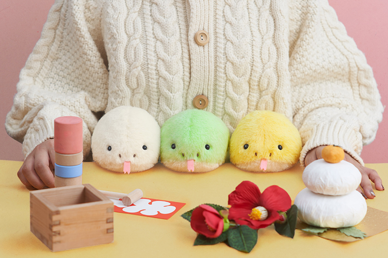 ちょこっと飛び出した舌やじゃばら模様のおなか、にょろっと伸びた尻尾など、ヘビの特徴をかわいらしく表現したデザインは、干支の商品としてはもちろん、ヘビ好きにもたまらないデザインとなっています。