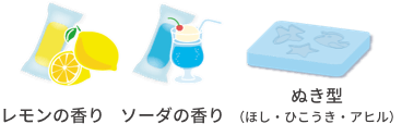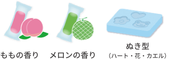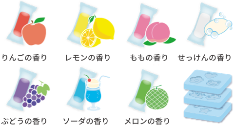 もも・メロン・レモン・ソーダ・りんご・ぶどう・せっけんの香り