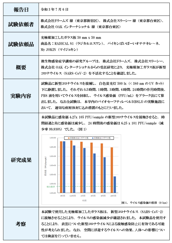 株式会社ドリームズは、公⽴⼤学法⼈奈良県⽴医科⼤学(医学部 微⽣物感染症学講座)及び⼀般社団法⼈MBTコンソー シアム(細井裕司理事⻑)協⼒のもと、『ラジカル エスワン』が新型コロナウイルスの不活化※に効果があることを確 認しました。