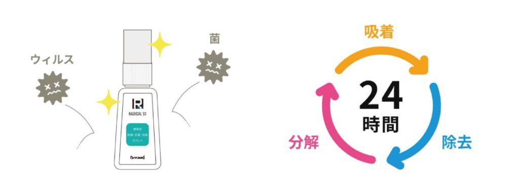 『ラジカル エスワン』の抗菌作用は、24時間持続。使用後も長時間、菌やウイルスを寄せ付けません。
